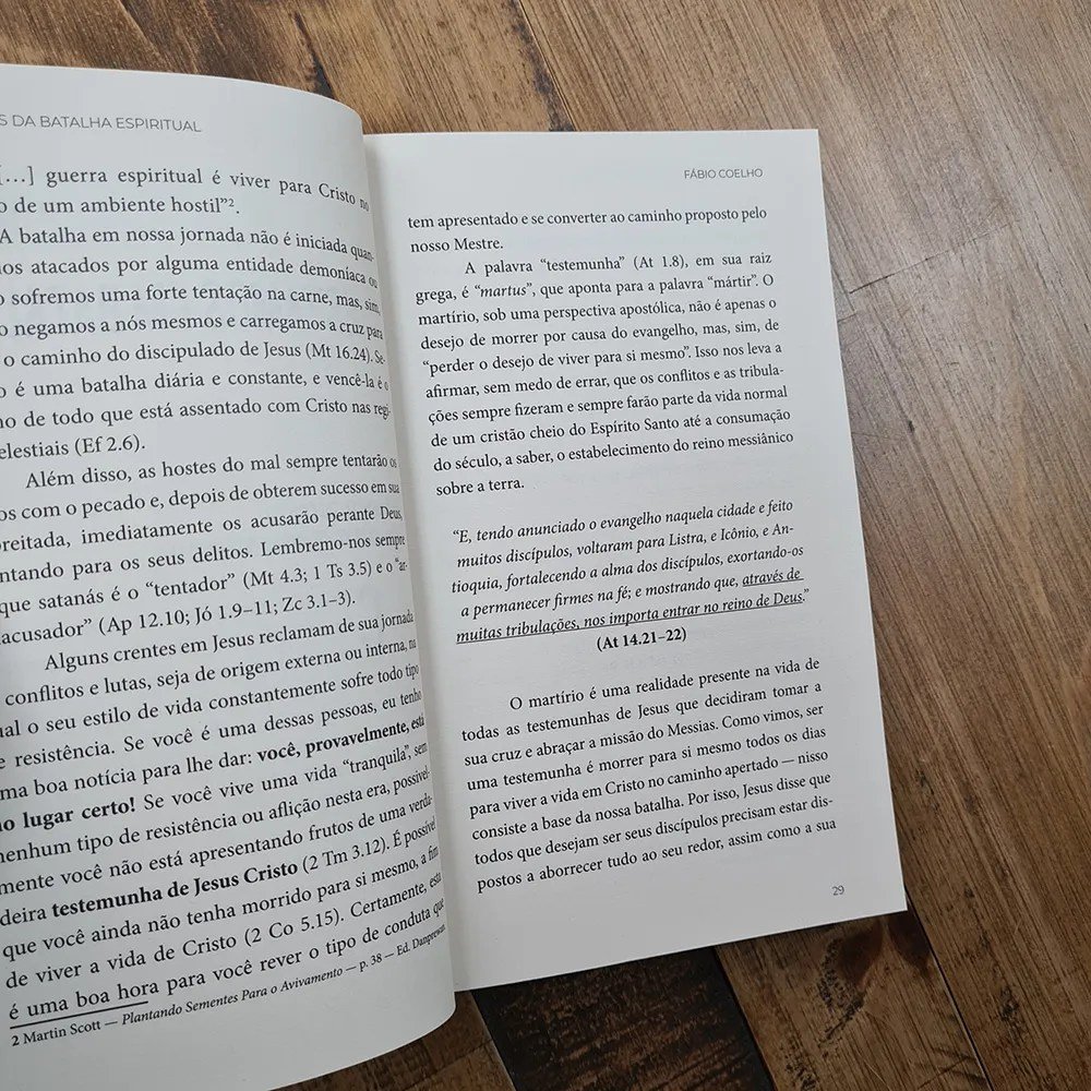 Em Princípios da Batalha Espiritual, Fábio Coelho apresenta princípios bíblicos e ao mesmo tempo práticos, de como vencer em Cristo o deus dessa era, o sistema do mundo, as obras da carne e as fortalezas mentais que levam cativo todo o conhecimento de Deus. O objetivo deste trabalho é descrever o triunfo de Cristo na cruz sobre todo o sistema das trevas de forma definitiva e fixas, assim como todos os desdobramentos da vitória do Senhor dos Exércitos, apontando para a realidade do seu reino eterno.